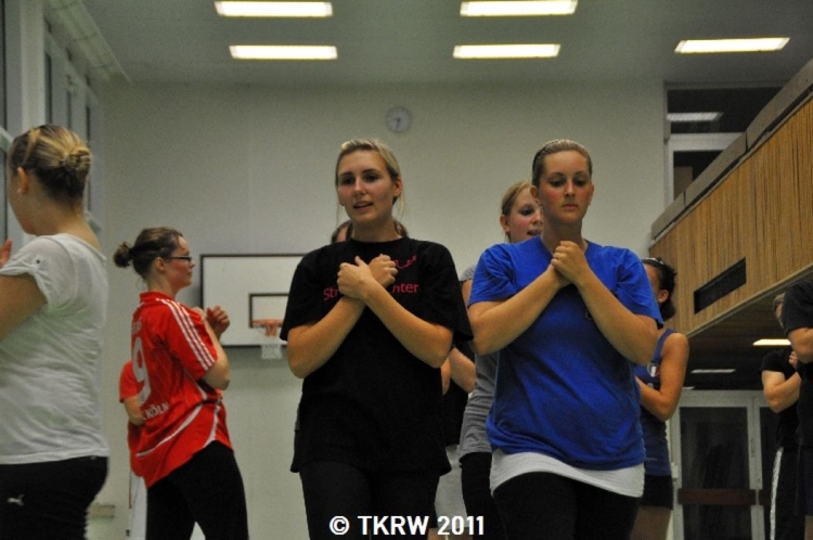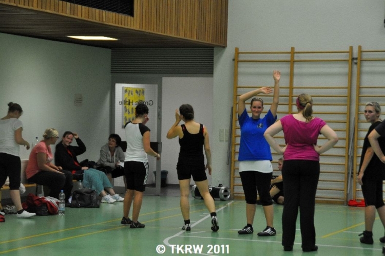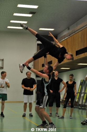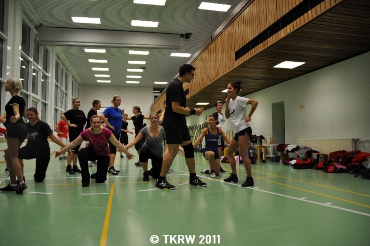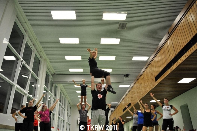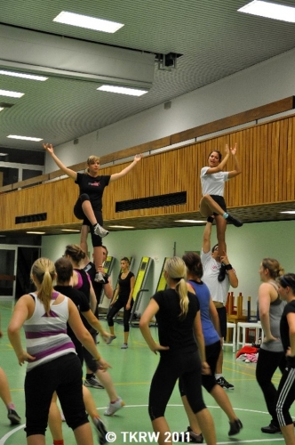 Während im Anschluß die „Bodencrew“ hauptsächlich von Ann-Kathrin betreut wird, so arbeitet Coach Oliver mit den Paaren und denen die es mal werden sollen. Jeweils die letzte halbe Stunde eines jeden Trainingstages (montags, bzw. mittwochs) steht dann das gemeinsame Proben der Auftrittsversionen der Tänze auf dem Programm, was der jeweilige Trainer (Oly oder Ann-Kathrin) genauestens beobachtet und analysiert. Denn leider steht uns keine Spiegelwand zur Selbstkontrolle zur Verfügung, was ein großer Wunsch vieler unserer Mädels wäre. Verschiedene Stellproben und das Austauschen der „Stammplätze“ in der Formation oder innerhalb der Paare gehören ebenso zum Trainingspensum dazu. Man muß „Ausfälle“ nämlich auch mal schnell kompensieren können. Und so rasant sind die jeweils 2 Stunden Training auch schon wieder vorbei…