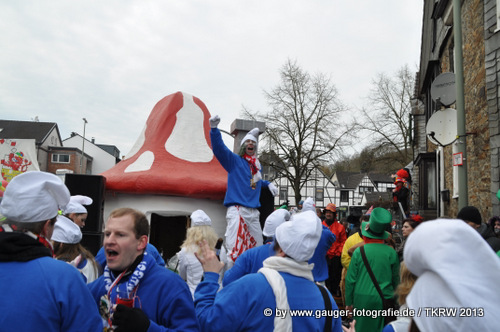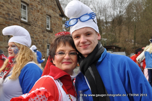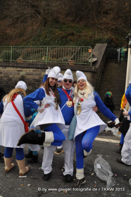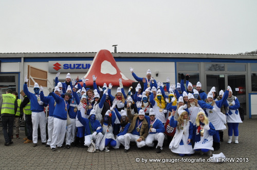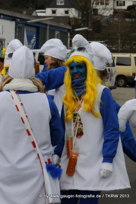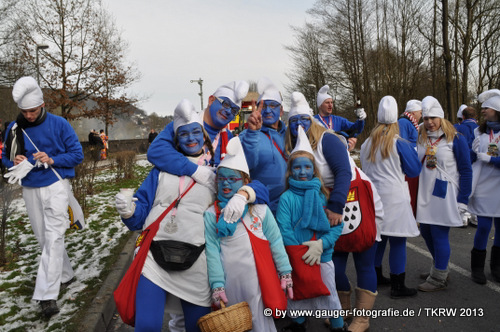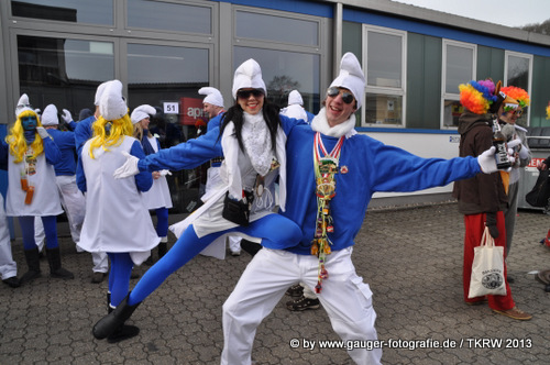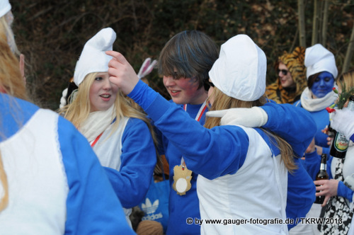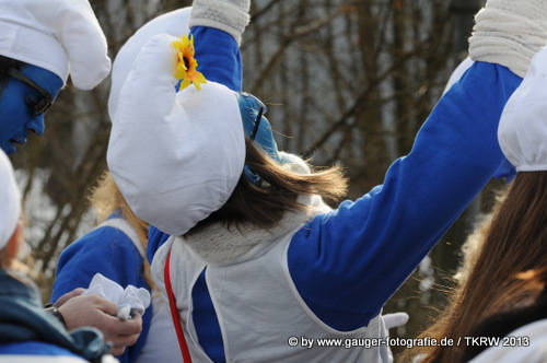 Die gesamte Truppe war super drauf und bereits die Wartezeit auf der Hardt wurde mit Stimmung, Tanz und dem Entern des Riesenpferdes der Musketiere verkürzt. Commanderschlumpf Daniel riss zwar der Henkel vom Wurfbeutel, aber er war erfinderisch. Ina und Yasmine entdeckten das Parkplatzschild an einem Autohaus und brauchten sofort ein Foto fürs heimische Album. Auch nicht zu verachten war die installierte Musikanlage, welche mittels Laptop und WLAN vom iphone aus gesteuert wurde. Natürlich mit Schlumpfen- und Karnevalshits und selbstverständlich rauchte es ordentlich aus dem Schornstein vom Schlumpfenhaus…Mit viel Liebe zum Detail waren die Teilnehmerinnen und Teilnehmer zurechtgemacht, so waren neben dem Commanderschlumpf auch Papa Schlumpf (JuKs-Frontmann Dennis), Haarstylistinnen-Schlumpfinen, Handy-Schlumpfinen, DJ-Schlümpfe, Schluckspechtschlümpfe und natürlich reichlich „Funkemariechen“-Schlümpfe dabei…