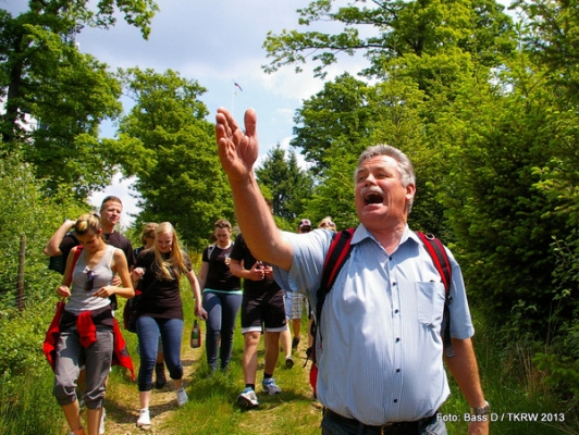 Die JuKs versorgten die durstigen Wanderer (Mann, war das steil hier hoch…) mit gekühlten Getränken. Nach einigen kurzen Grußworten (fast hätte er uns vergessen…, aber wir haben ihn nett erinnert) des neuen 1. Vorsitzenden, Armin Gries, und einer Verschnaufpause ging es über den „Bergischen Panoramasteig“ am Kriegerdenkmal (Pause !!!) vorbei in Richtung Bellingroth. Auch hier sorgten die JuKs für Sicherheit im Straßenverkehr und sperrten kurzerhand die Verbindungsstraße für die schnellen Wanderer, denn von nun an gings bergab mit uns.
