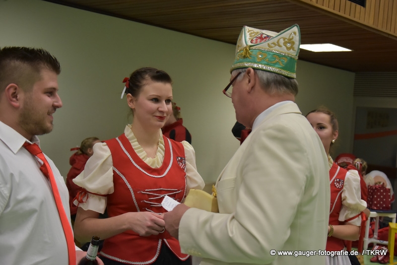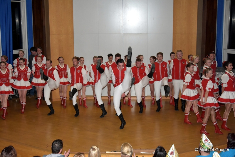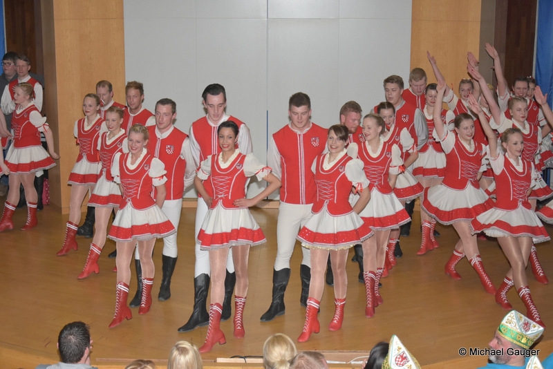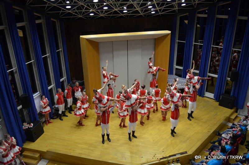 Doch unsere Sorgen waren völlig unbegründet, alle waren sehr begeistert! Besonders gut kam das „kurze Solo“, am Anfang des Tanzes, von einem unserer Tanzoffiziere an. Auch die beiden anderen Tänze klappten für den ersten, richtigen Auftritt in dieser Session, gut. Unsere Leiterin, Silvia Gries, stellte daraufhin alle Mädels und Paare namentlich dem Publikum vor. Ebenso wurden unsere Neuzugänge vorgestellt und sie bekamen den TKRW-Jubiläumssticker vom letzten Jahr verliehen. Einige Tänzer und Tänzerinnen, die nun 3 Jahre dabei sind, hatten sich die goldene Anstecknadel verdient. Überreicht wurden diese jeweils nach dem Auftritt von Armin Gries, dem 1. Vorsitzenden der KG.