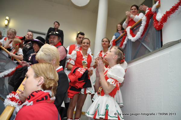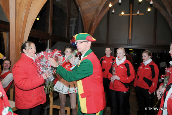 Die Familiensitzung in der Aggertalklinik Engelskirchen war der Abschluß eines schönen, aber auch sehr anstrengenden Wochenendes. Ein abwechslungsreiches Programm hatte man hier zusammengestellt, bei dem natürlich die vereinseigenen Gruppierungen nicht fehlten. Nachdem die Minis und die Kleinen bereits ihre Auftritte hatten, und auch die Schlossgarde bereits ihre Aufwartung gemacht hatte, waren wir nach einem Rednerduo dran. Daniel meinte er ließe heute lieber mehr tanzen, als das er reden würde. Nach dem Opener, der „Rosalie“, lief es dank einem speziellen „Präsidenten-Rednerstimme-Erholungsbonbon (Normalsterbliche sagen „Husten-Klump“ dazu..) dann besser, denn auch hier gab es noch Jecke die unseren „Piraten“ noch nicht kannten und mit einer Reizüberflutung zu kämpfen hatten. Denn bei diesem Tanz passiert so viel gleichzeitig, den muss man mehrmals sehen um alles mitzubekommen. Mit dem Baumarkt als Zugabe verabschiedeten wir uns von der Bühne, nicht ohne jedoch unsere ehemalige Mitstreiterin Claudia herzlich zu grüßen, die uns mit ihrer Anwesenheit beglückte. Zur Überraschung aller zauberte „Onkel“ Paul Remmel zum Abschluß drei morgens frischgepflückte ( so seine Aussage) Blumensträuße aus dem Hut und überreichte diese Silvia und den beiden Co-Trainerinnen Ann-Kathrin und Ina, bevor er auch die Paare noch schnell vorstellte und Coach Oly grüßte. Im Gegenzug bedankten wir uns mit der Verleihung unserer „Ehren-TKRW-Spange“ bei den Verantwortlichen der Klinikleitung, die immer ein offenes Ohr für uns haben und die uns u.a. auch die Trainingsräumlichkeiten zur Verfügung stellen, was nicht selbstverständlich ist.