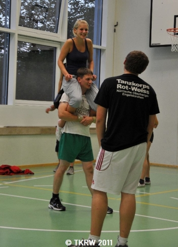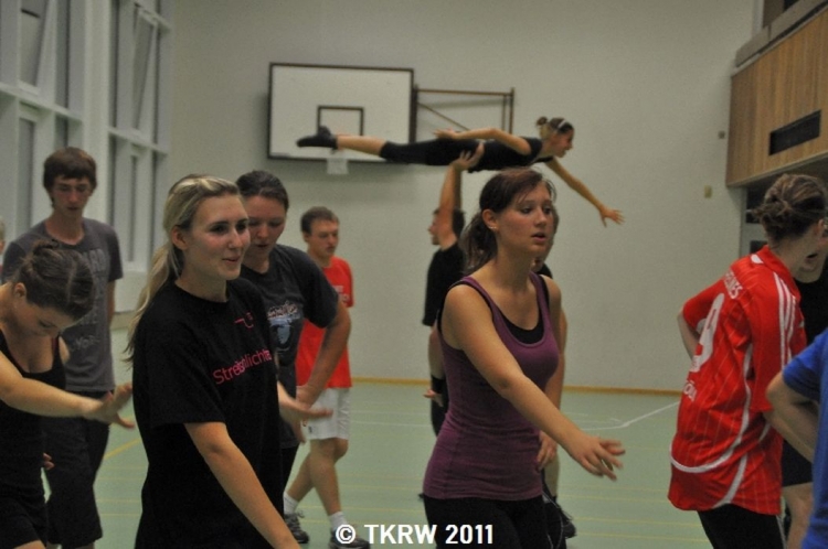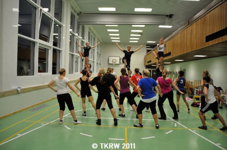 Während im Anschluß die „Bodencrew“ hauptsächlich von Ann-Kathrin betreut wird, so arbeitet Coach Oliver mit den Paaren und denen die es mal werden sollen. Jeweils die letzte halbe Stunde eines jeden Trainingstages (montags, bzw. mittwochs) steht dann das gemeinsame Proben der Auftrittsversionen der Tänze auf dem Programm, was der jeweilige Trainer (Oly oder Ann-Kathrin) genauestens beobachtet und analysiert. Denn leider steht uns keine Spiegelwand zur Selbstkontrolle zur Verfügung, was ein großer Wunsch vieler unserer Mädels wäre. Verschiedene Stellproben und das Austauschen der „Stammplätze“ in der Formation oder innerhalb der Paare gehören ebenso zum Trainingspensum dazu. Man muß „Ausfälle“ nämlich auch mal schnell kompensieren können. Und so rasant sind die jeweils 2 Stunden Training auch schon wieder vorbei…