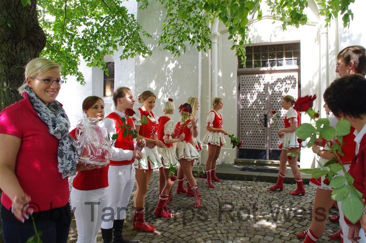 Also war es keine Frage für das Tanzkorps Rot-Weiss an diesem wunderschönen Tag zu diesem besonderen Anlass vor der Kirche Spalier zu stehen. Und das diese Überraschung gelungen war sieht man an den strahlenden Gesichtern von Braut und Bräutigam…