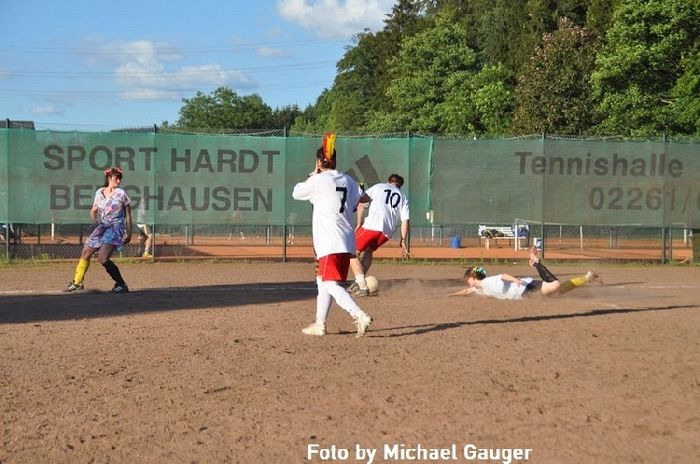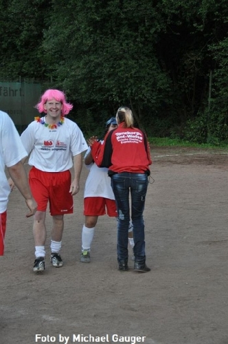 Zur Stärkung gab es zwischendurch genug Essen (u.a. Gelpetal-Burger) und auch zu Trinken. Also konnte es losgehen . Als das TKRW das Eröffnungsspiel bestritt gab es schon viel zu lachen. Mussten doch alle Teilnehmer, wie schon oben beschrieben, mit mindestens einem karnevalistischem Utensil oder Kleidungsstück auf dem Platz antreten. Wer keins hatte durfte eigentlich nicht mitspielen.