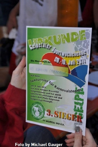 Die Spieldauer war jeweils 1 x 10 Minuten. Von den 5 zu absolvierenden Spielen haben wir letztendlich noch die letzten 3 Spiele gewinnen können. Zur Abkühlung gab es nach jedem Spiel einige leckere Bierchen. Als alle Spiele durch waren kam die große Siegerehrung . Alle Mannschaften bekamen eine Urkunde und die ersten 3 Plätze dann zusätzlich noch eine große Stange Kölsch zum selberzapfen als Siegprämie. Der Gewinner des Turniers erhielt zudem einen Wanderpokal (der war aber wohl gerade noch zum gravieren weg). Der Wanderwart lobte außerdem noch einen Sonderpreis für die schönste Kostümierung aus. Wir erreichten einen guten 3. Platz, den wir hinterher ordentlich gefeiert haben.