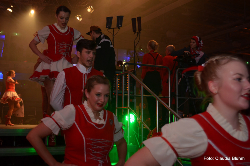 Weil wir nicht zum ersten Mal für einen Auftritt dort waren, kannten die meisten den Ablauf vor Ort. Für einige unserer Neuzugänge sollte es jedoch ihre Feuerprobe in rot-weißer Kluft werden. Es ist definitiv eine Hausnummer und ein tolles Gefühl vor über 4.000 Karnevalsjecken in so einer großen Halle zu tanzen und ordentlich Stimmung zu machen. Beim Warmmachen und Dehnen hörten wir ein wenig Musik von der Engelskirchener Band „The Höösch“, die den ausgeschriebenen Bandcontest gewonnen hatte und den Samstag für ihren Gig auswählte. Im Vorfeld hatten wir uns schon mit der Band zu einem gemeinsamen Foto im Foyer verabredet, worauf wir uns auch schon freuten.