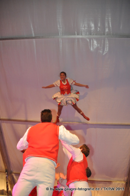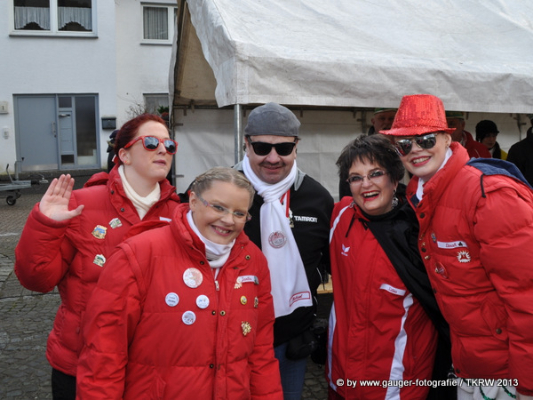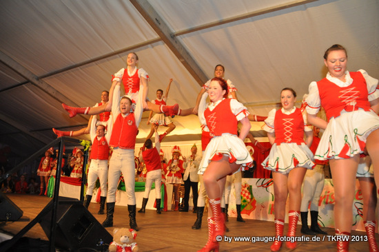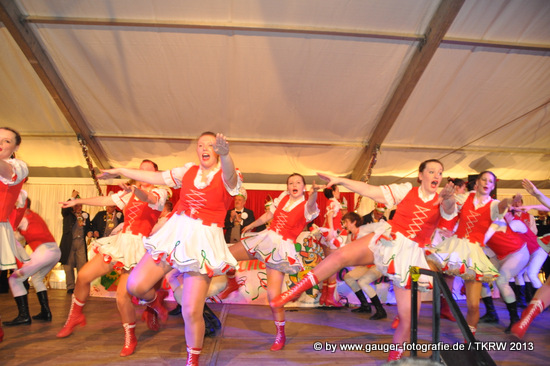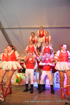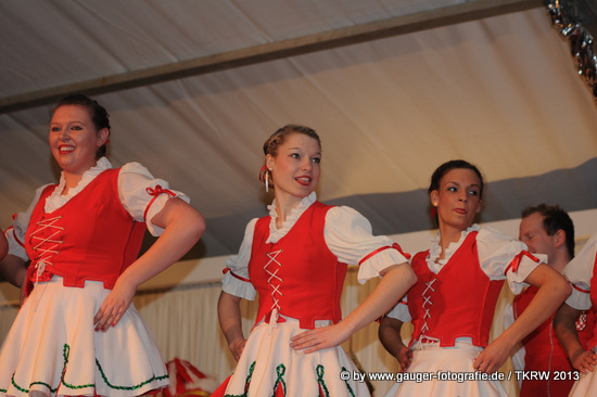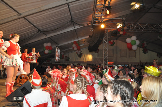 Hier war unser Einmarsch dann genau das Gegenteil, nämlich beträchtlich länger als sonst. Da das Zelt aber in „unseren“ Farben, also rot-weiß, geschmückt war glich das Ganze dann doch wieder einem Triumphzug durch ein tolles Publikum. Allerdings agierten wir an diesem Abend als eine Art „Stiftung Bühnen-Test“, denn leider war nach unserem Auftritt die Bühne etwas ramponiert. Kommandant Daniel hatte während unseres Auftritts bereits nach dem ersten Tanz erhebliche Mühe wieder zu Wort zu kommen, denn das jecke Publikum hörte überhaupt nicht mit den „Fan-Gesängen“, wie z.B. „Oh, wie ist das schööööön !“, auf.