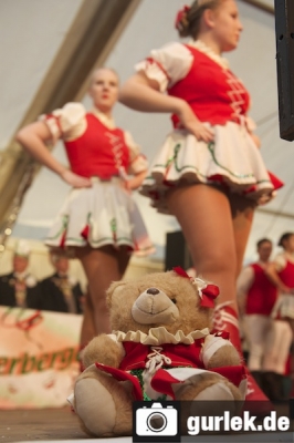 Deshalb war der Einmarsch wieder besonders toll, denn auch hier wurde begeistert mitgeklatscht. Die Security bahnte unserem Standartenträger einen Weg zur Bühne nachdem wir unsere Pyramide am Eingang wieder „abgebaut“ hatten, denn jeder wollte einen guten Blick auf das Geschehen haben. Kommandant Daniel begrüßte überschwänglich die Herren der Schöpfung, deren Echo auf seine Frage nach dem Befinden recht laut mit „JA“ ausfiel.