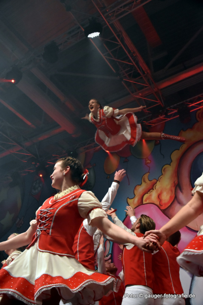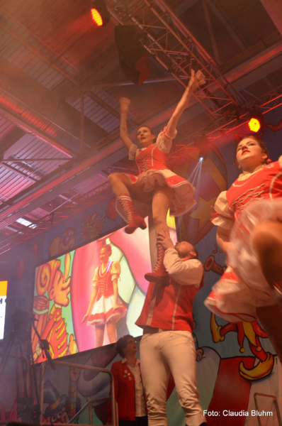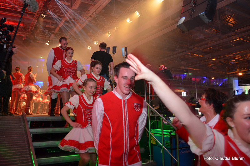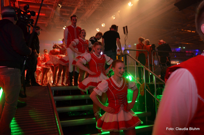 Weil wir nicht zum ersten Mal für einen Auftritt dort waren, kannten die meisten den Ablauf vor Ort. Für einige unserer Neuzugänge sollte es jedoch ihre Feuerprobe in rot-weißer Kluft werden. Es ist definitiv eine Hausnummer und ein tolles Gefühl vor über 4.000 Karnevalsjecken in so einer großen Halle zu tanzen und ordentlich Stimmung zu machen. Beim Warmmachen und Dehnen hörten wir ein wenig Musik von der Engelskirchener Band „The Höösch“, die den ausgeschriebenen Bandcontest gewonnen hatte und den Samstag für ihren Gig auswählte. Im Vorfeld hatten wir uns schon mit der Band zu einem gemeinsamen Foto im Foyer verabredet, worauf wir uns auch schon freuten.