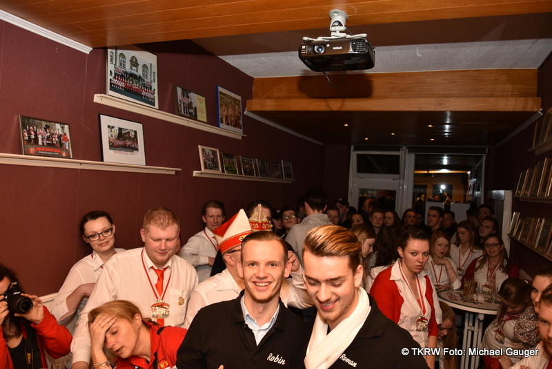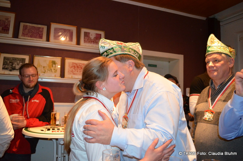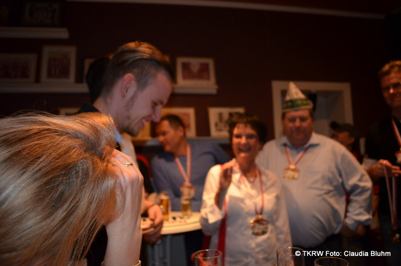 Dreigestirn der aktuelle Prinzenorden an die Gruppen der KG verliehen wird. Wir vom TKRW waren als Erste dran und in Dreier-Grüppchen erhielten wir unseren Orden. Danach saßen wir noch einen Moment zusammen, entweder um zu klönen oder ein Häppchen zu essen und natürlich wurde wie jedes Jahr noch ordentlich gefeiert ! Auch diesmal gings wieder über Tische und Bänke, wie die Bilder zeigen…